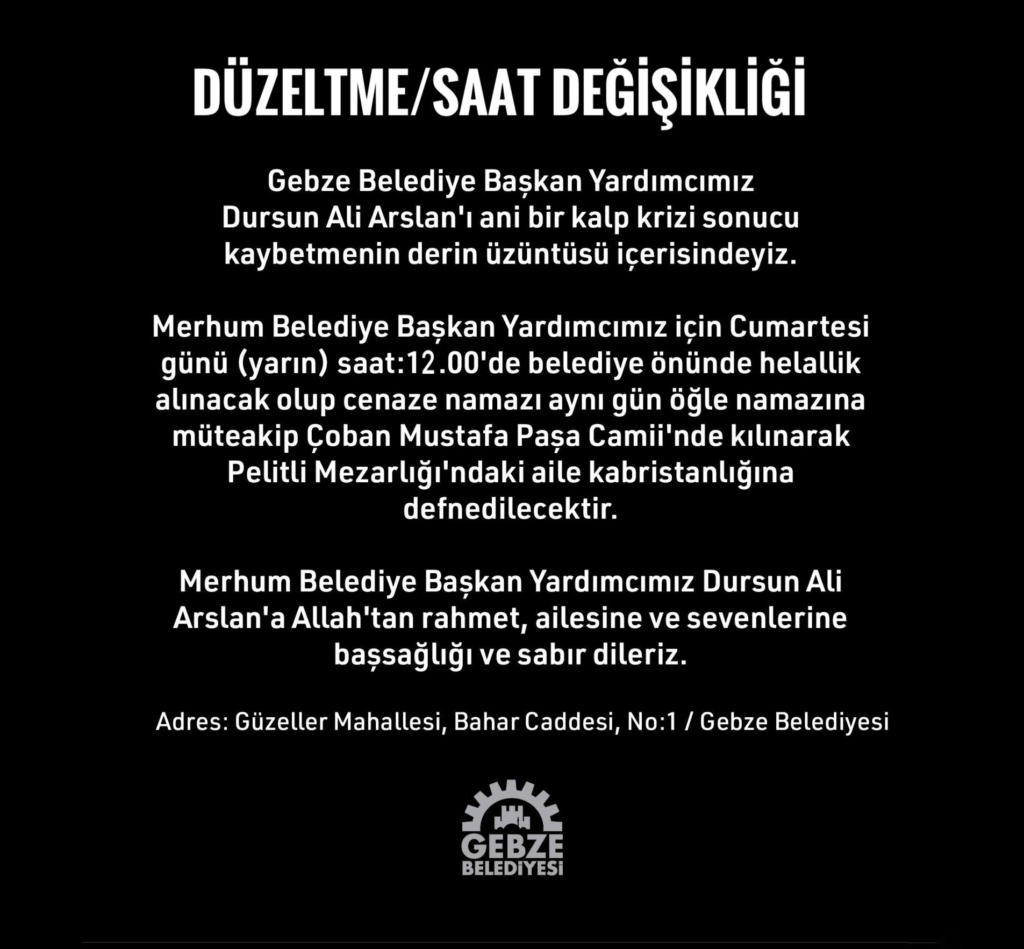 Acı haberi Gebze Belediye Başkanı Zinnur Büyükgöz duyurdu. Büyükgöz, “Kıymetli yol arkadaşım, Belediye Başkan Yardımcımız Dursun Ali Arslan’ı kaybetmenin derin teessürünü yaşıyoruz. Onu; mütevazılığı, çalışkanlığı ve Gebze’mize yaptığı hizmetlerle hatırlayacağız” dedi.